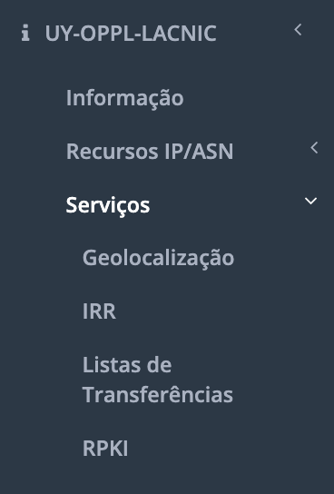 No menu de contexto da organização, na opção [Serviços] / [RPKI], você pode acessar o módulo do RPKI.