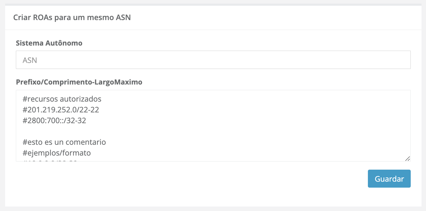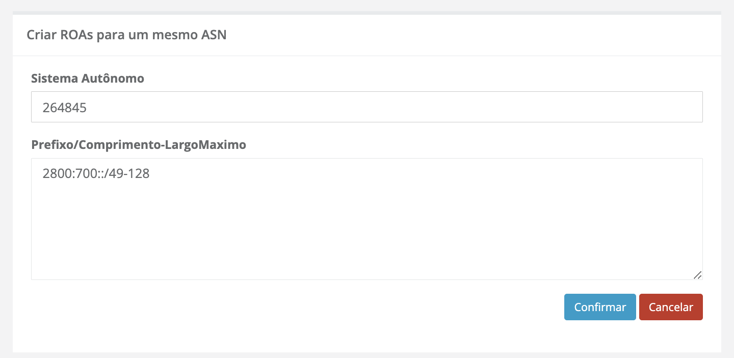Na seção RPKI, encontrará a interface de criação de ROAs. Na opção “Criar ROAs para um mesmo ASN”, poderá criar um ou mais ROAs para um mesmo ASN: