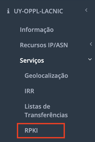 No menu de contexto da organização, na opção [Serviços] / [RPKI], você pode acessar o módulo do RPKI: