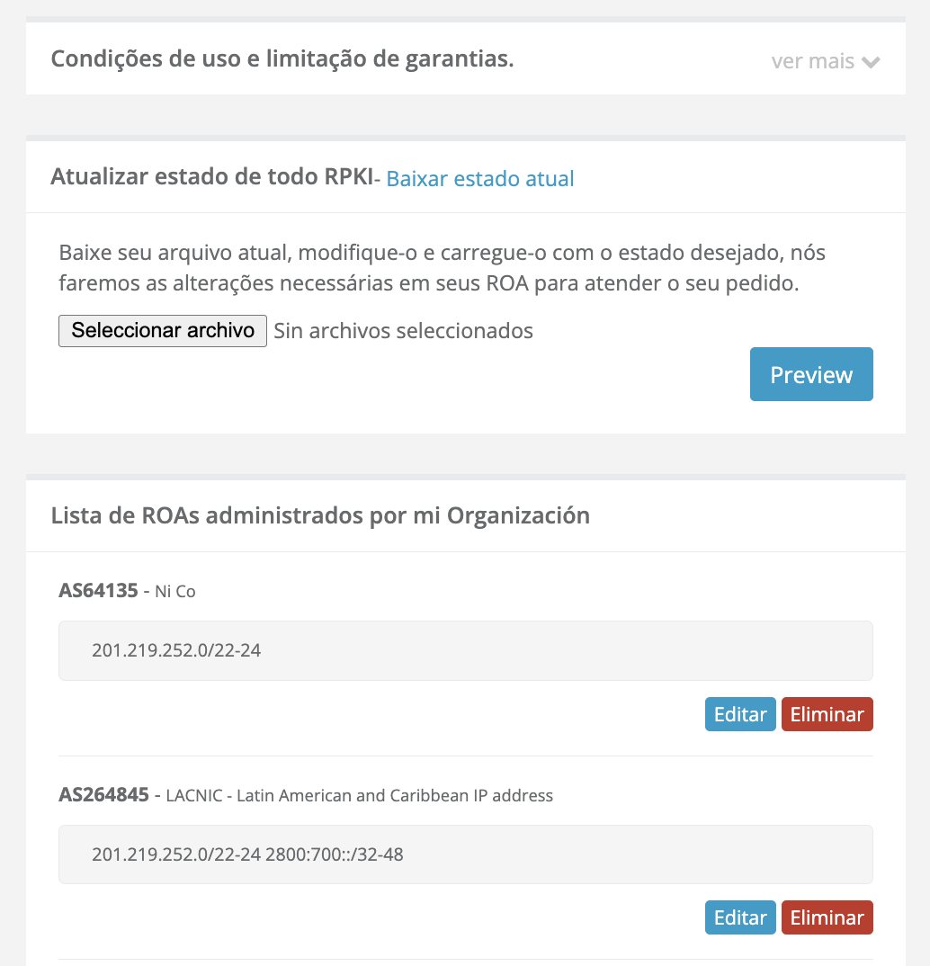 Também encontrará a seção “Lista de ROAs administrados pela minha organização”, em que poderá visualizar, editar e/ou eliminar os ROAs da sua organização.