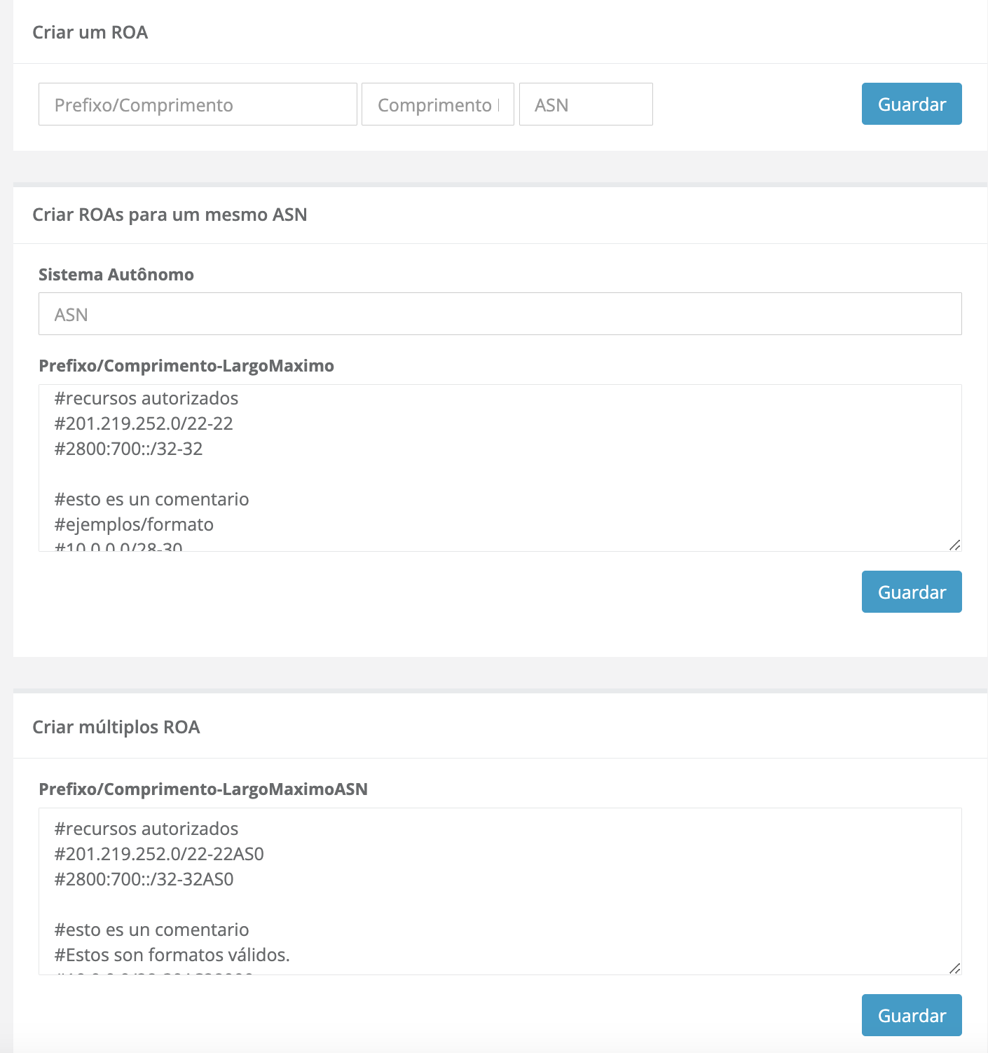 Na seção RPKI, encontrará a interface de criação de ROAs, com três métodos de entrada que poderá usar para inserir um único ROA ou vários, [LINK ARTIGO Criar um ROA], [LINK ARTIGO Criar ROAs para um mesmo ASN] e [LINK ARTIGO Criar múltiplos ROAs]