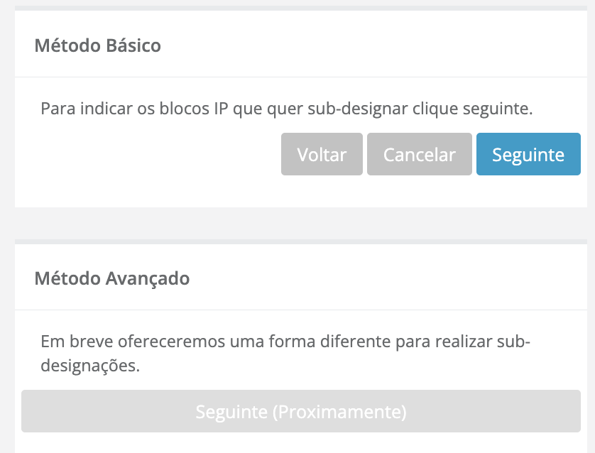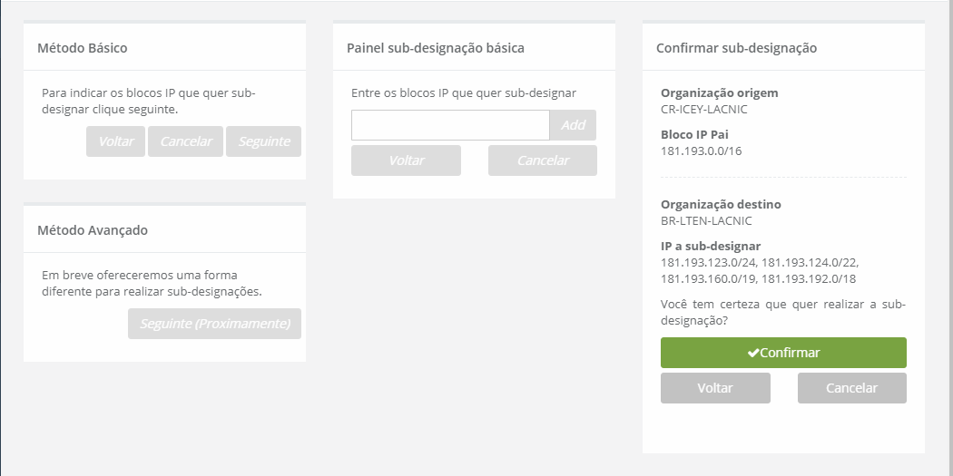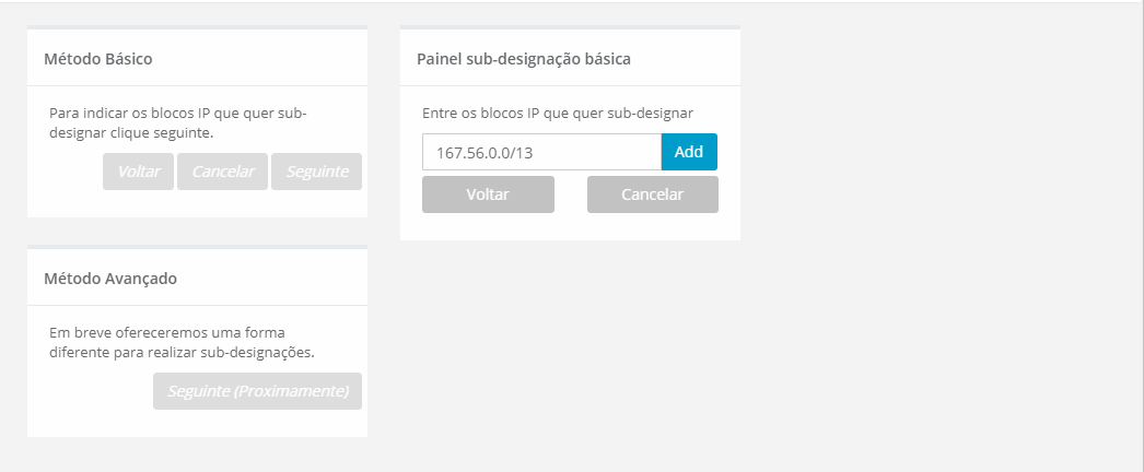 No painel do método básico, clique no botão [Seguinte] para iniciar o processo para subdesignar, o painel mostrará um bloco IP predefinido para designar à organização selecionada.