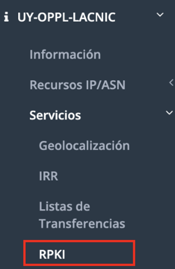 No menu de contexto da organização, selecione a opção [Serviços] / [RPKI], e a partir daí você pode acessar a seção para criar ROAs e administrar os detalhes sobre o RPKI.