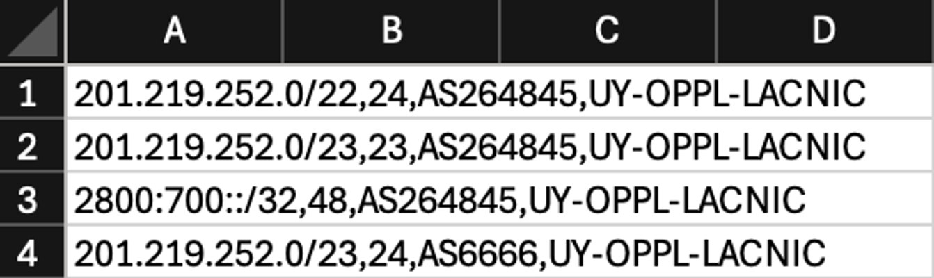 - Usando a linha 4 (201.219.252.0/23,24,AS6666,UY-OPPL-LACNIC) como exemplo, temos: