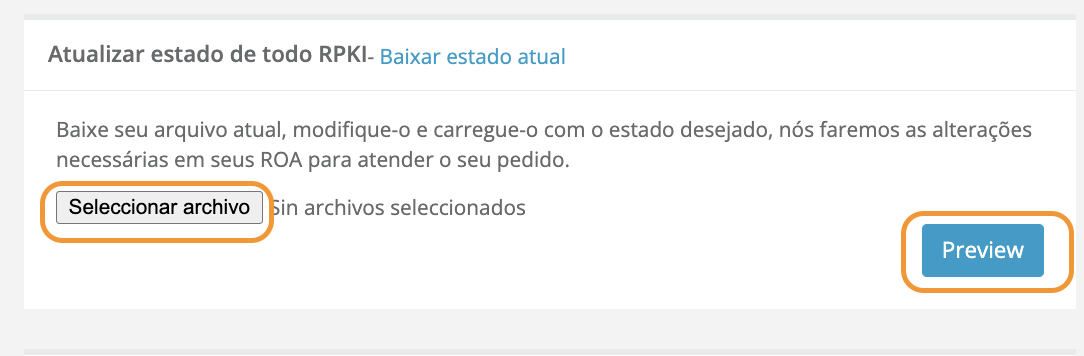 Feitas as alterações (e salvo o .csv), retornamos à interface de criação de ROAs e selecionamos a opção [Selecionar arquivo] e anexamos o arquivo .csv modificado.