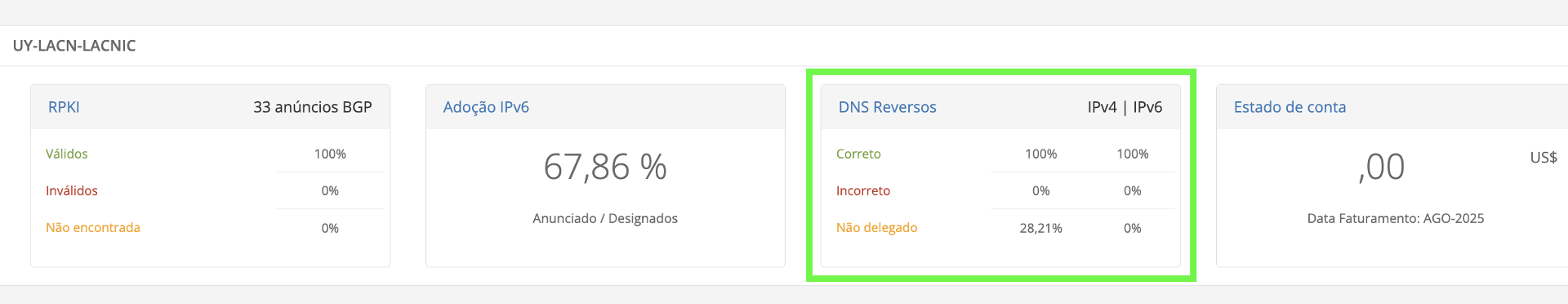 No Dashboard inicial você poderá visualizar no painel principal um resumo com as informações do estado dos rDNS para os blocos IPv4 e IPv6 pertencentes a suas organizações.