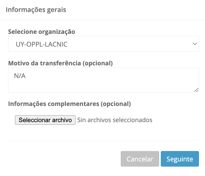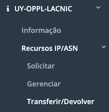 Do menu de contexto da organização na opção [Serviços] / [Lista de Transferências], você poderá acessar a seção Transferir IPv4, IPv6 e/ou ASN - LISTA DE TRANSFERÊNCIAS.