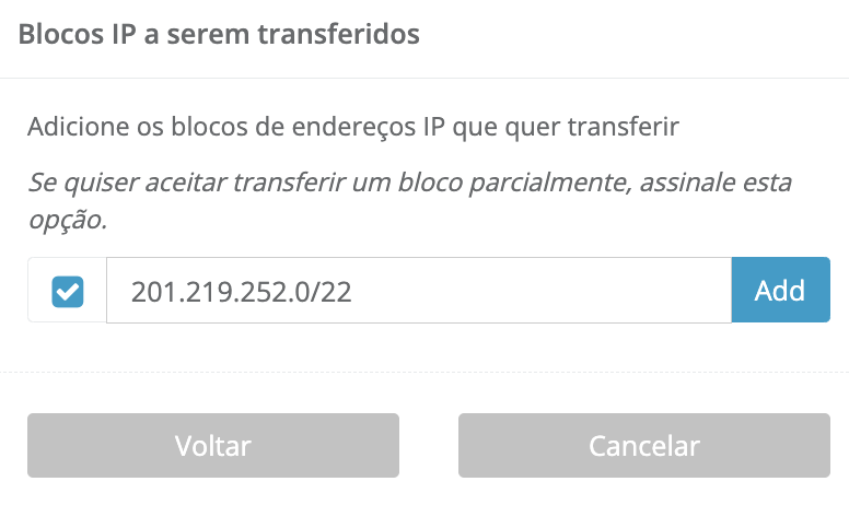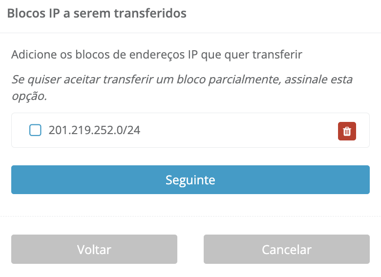 Nesta lista, além de poder eliminar IP da lista, você poderá assinalar se aceitaria transferir esses IP de forma parcial.