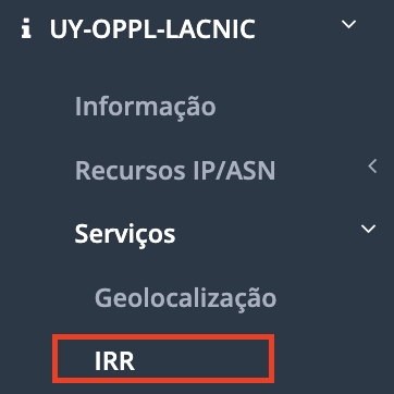 Para começar a usar o IRR, gerar objetos com base nas informações existentes e habilitar a criação de as-set, deve acessar a opção [Serviços] / [IRR] no menu de contexto da organização.