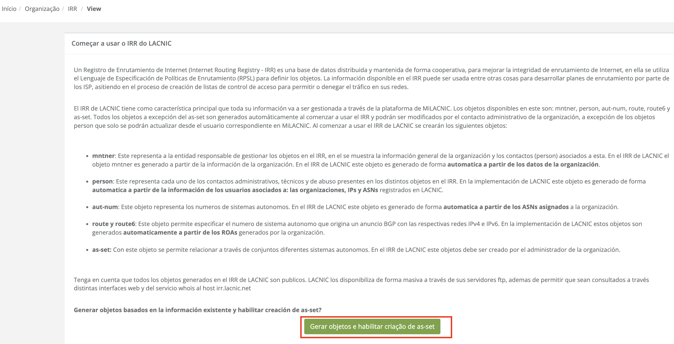 Todos os objetos, com exceção do as-set, são gerados automaticamente ao começar a usar o RPKI e poderão ser modificados pelo contato administrativo da organização; excepcionalmente, os objetos person podem ser atualizados apenas pelo usuário correspondente no MiLACNIC.