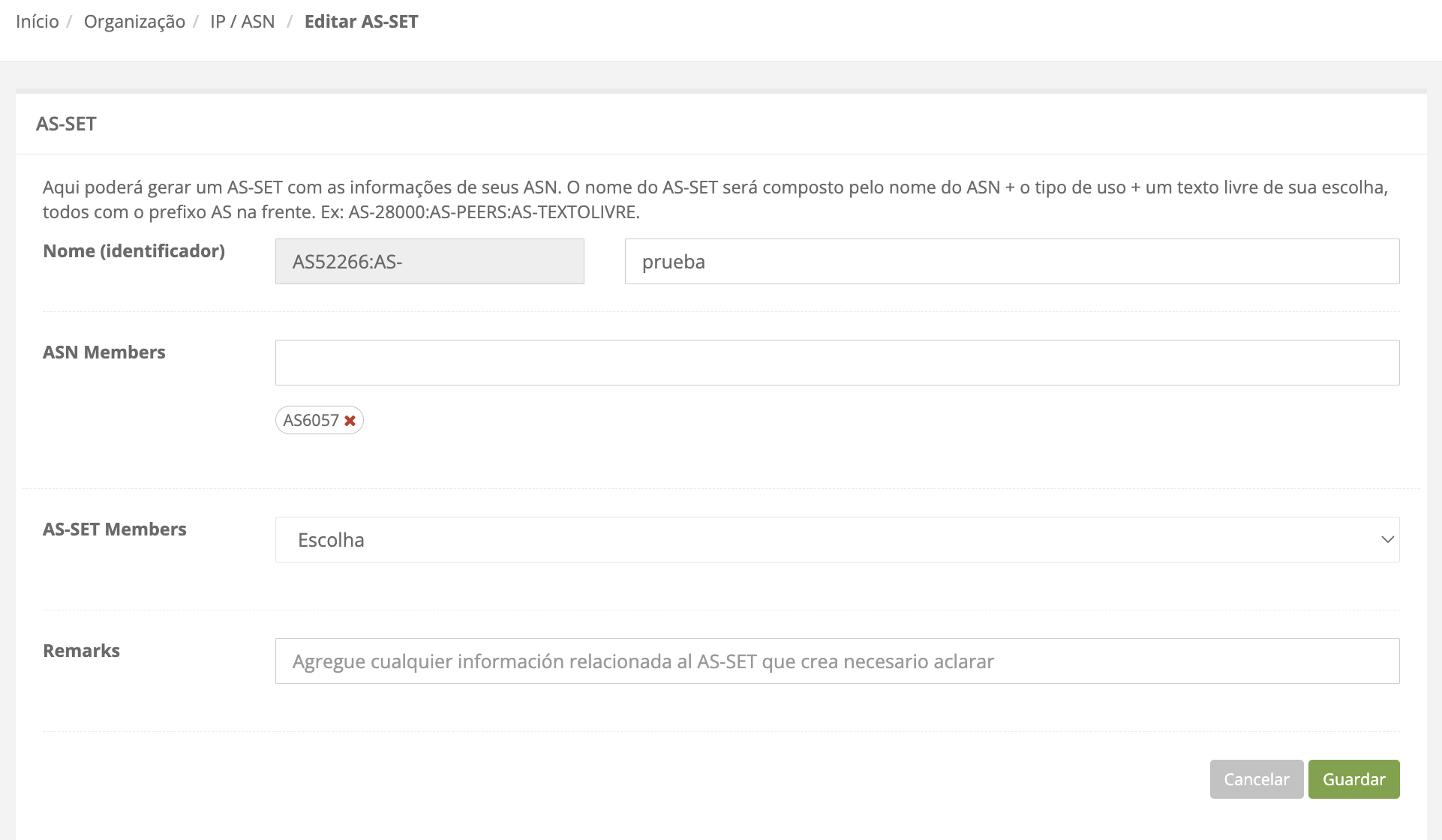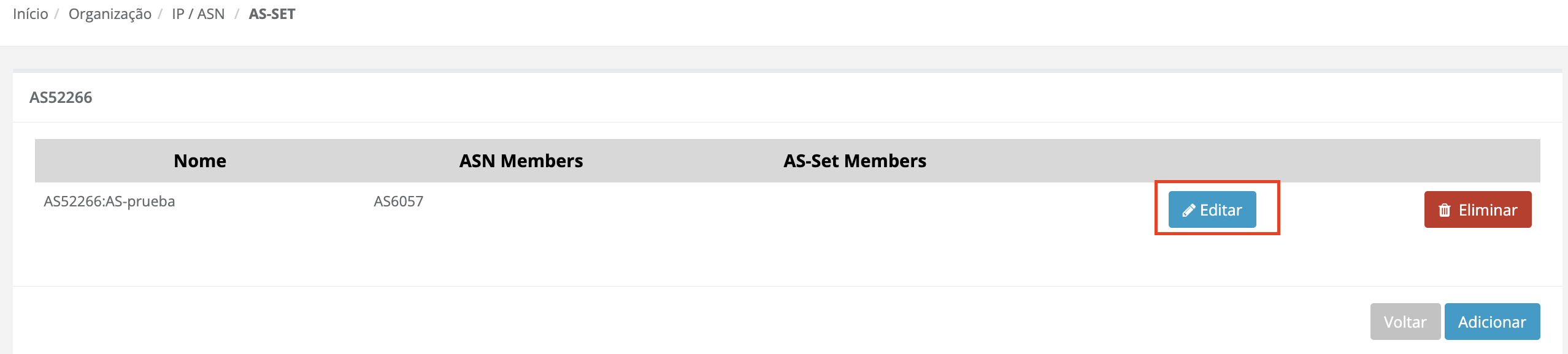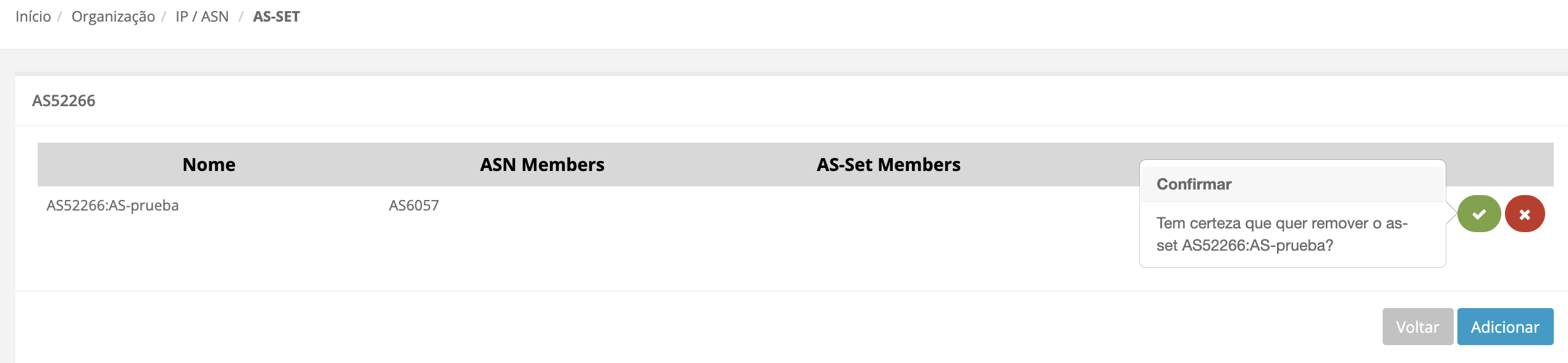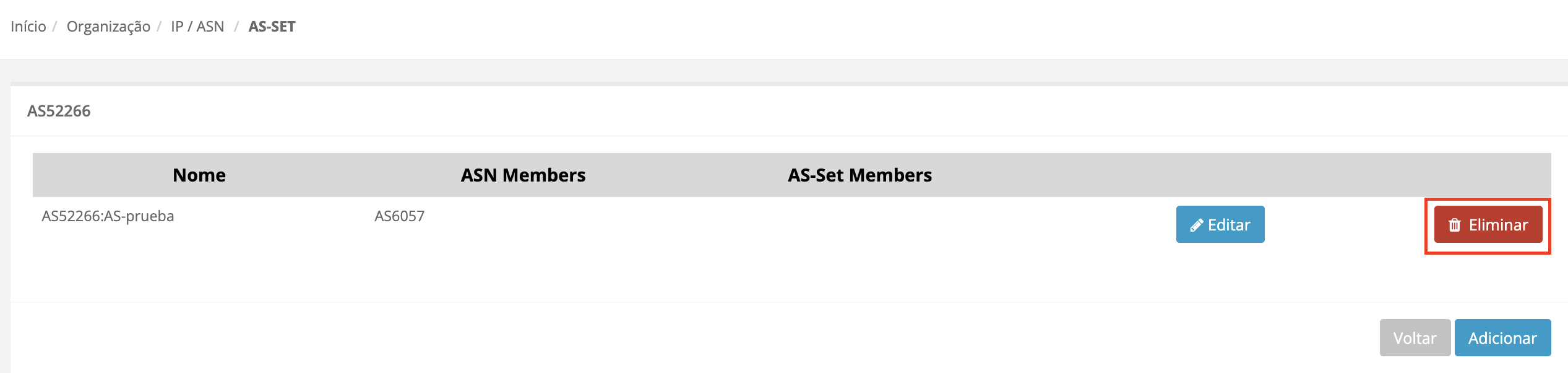 Para eliminar um as-set pode acessar desde a lista de as-set, selecionando o botão [Remover] do as-set que quiser eliminar.