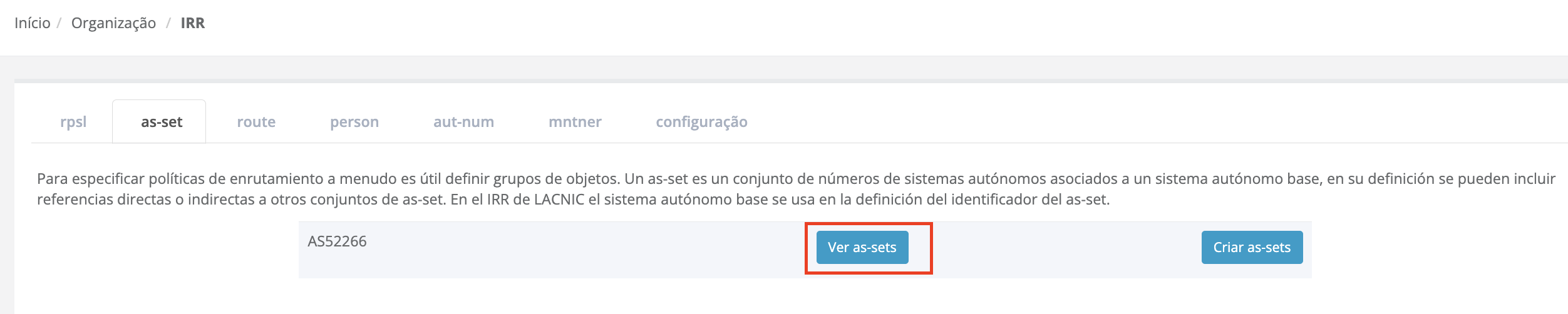 Na aba [as-set] selecionar a opção [Ver as-set] para exibir a listagem de todos os objetos as-set: