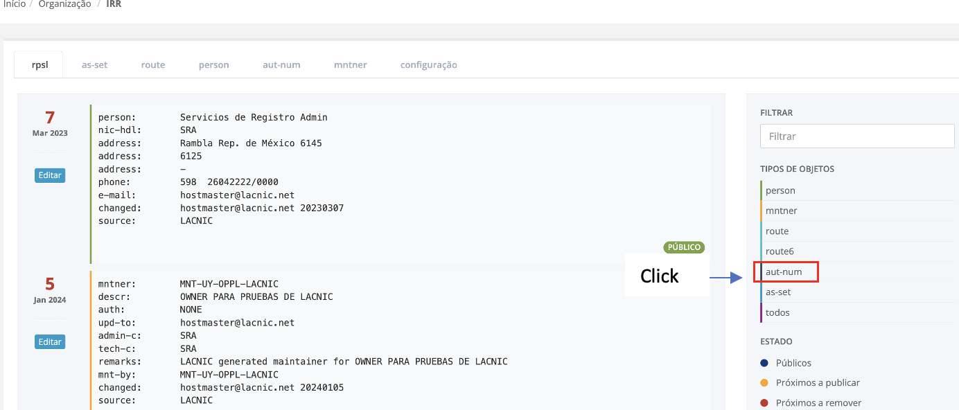 Mostra-se na aba [rpsl] a listagem de todos os objetos do IRR. Pode procurar os objetos aut-num filtrando no painel à direita por tipo de objeto ou por tags:
