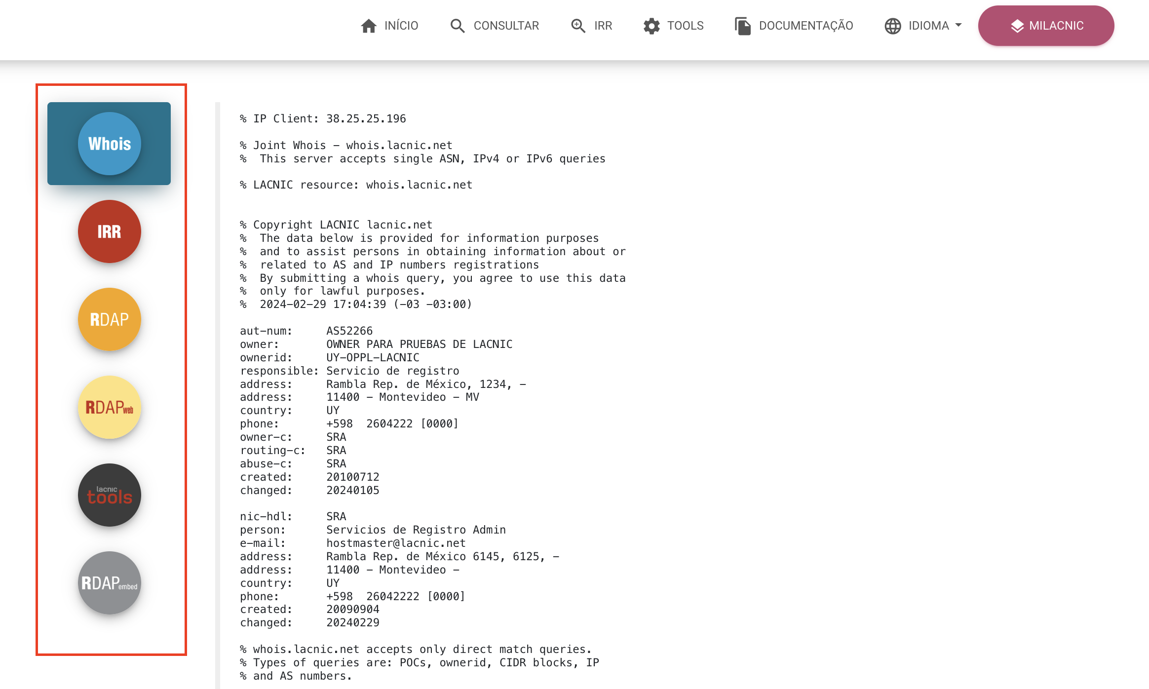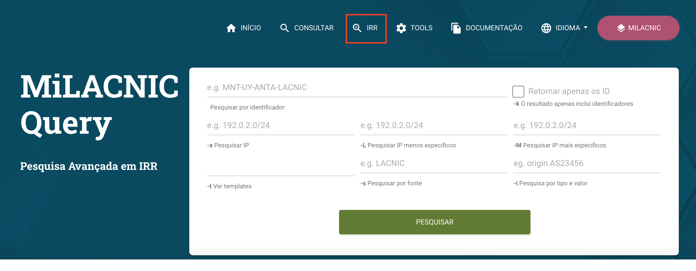 Você pode consultar as informações do IRR na plataforma de consultas centralizadas de LACNIC, MiLACNIC Query, que possui uma seção especial para o IRR.