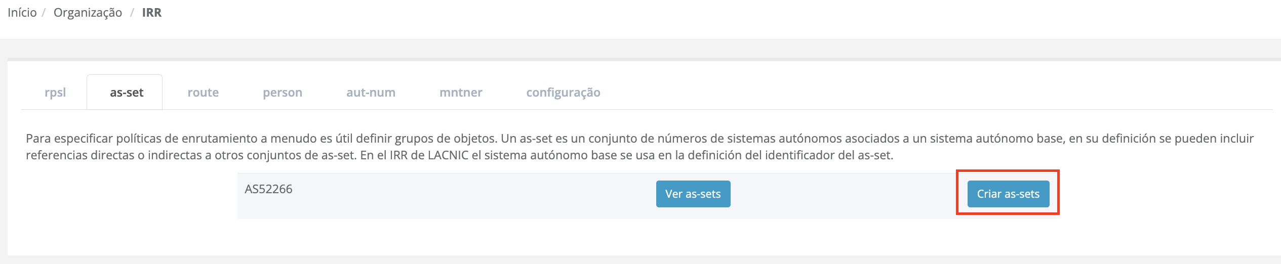 Deve ser selecionado o botão [AS-SET], que o levará ao painel de gerenciamento dos objetos as-set desse sistema autônomo. Clique no botão [Criar as-sets] à direita na listagem de AS: