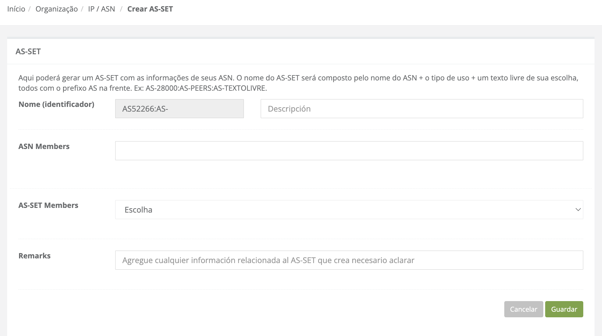 *Nota: O nome do as-set será um texto exclusivo composto pelo nome do AS + uma descrição com o prefixo AS. Ex: AS28000:AS-DESCRIPCION.