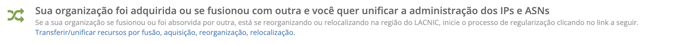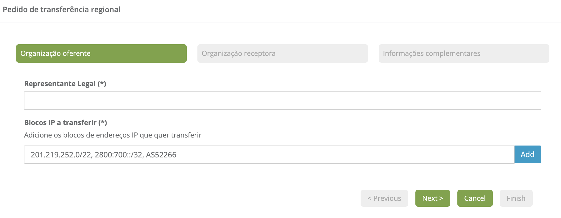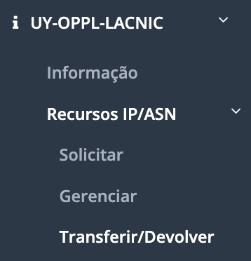 Do menu de contexto da organização, na opção [Recursos IP/ASN] / [Transferir/Devolver] você poderá acessar a seção: TRANSFERIR IPv4, IPv6 e/ou ASN - LISTAS DE TRANSFERÊNCIAS: