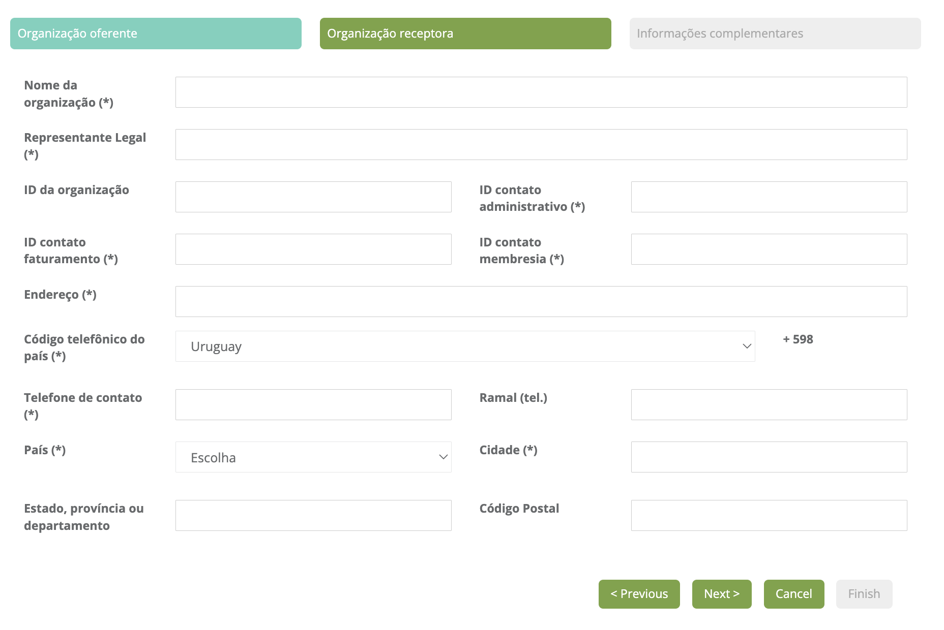 Assim que os dados estiverem completos, clicar no botão [Next>]. A seguir, preencha os dados solicitados da organização receptora. Os dados solicitados são os seguintes: