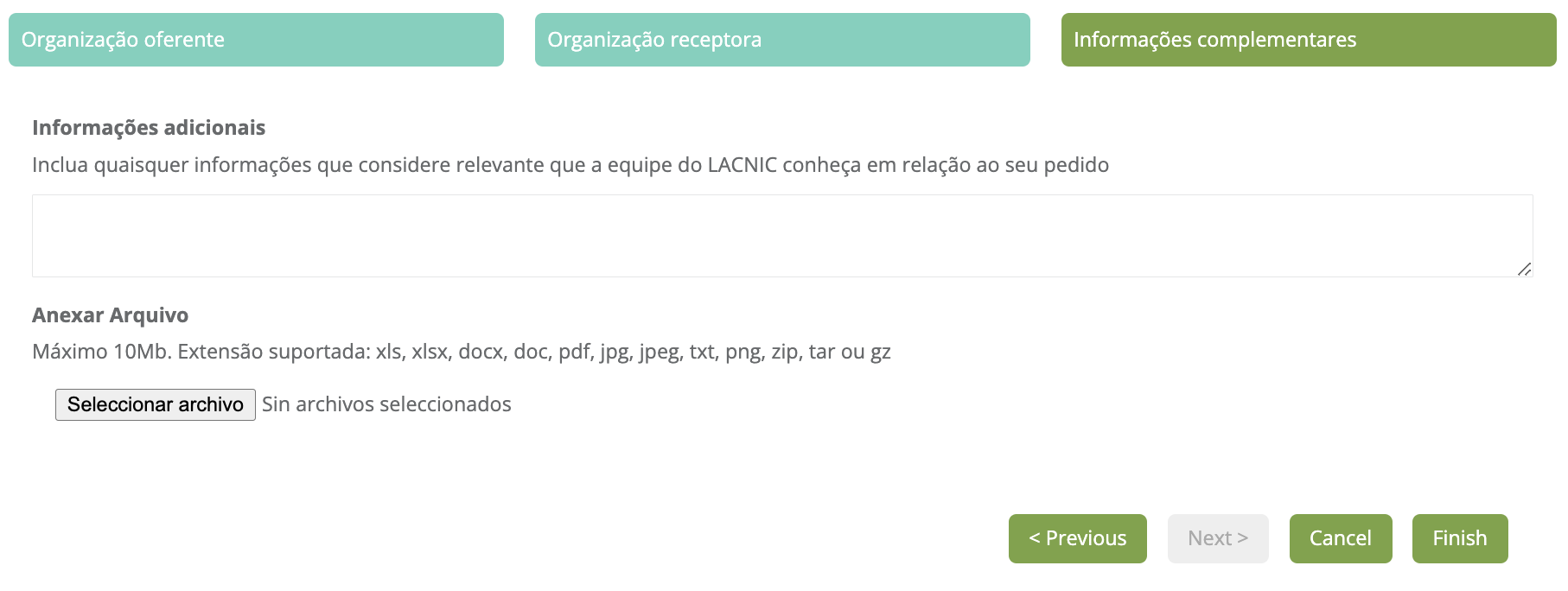 Por último, são mencionadas Informações complementares onde é exibido um formulário para poder adicionar informações que ajudem a argumentar seu pedido de fusão; também poderá anexar um arquivo: