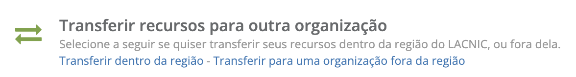Do menu de contexto da organização, na opção [Recursos IP/ASN] / [Transferir/Devolver] você poderá acessar a seção: TRANSFERIR IPv4, IPv6 e/ou ASN - LISTAS DE TRANSFERÊNCIAS