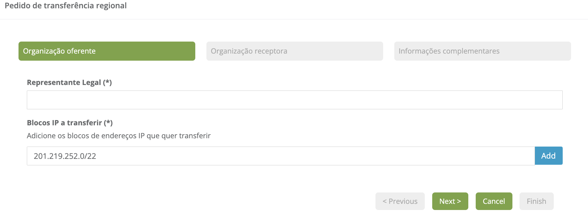 Preencha os dados solicitados da organização oferente. Os dados solicitados são os seguintes:
