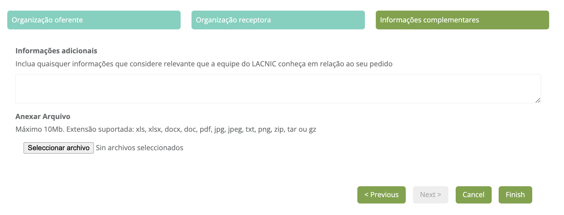 A seguir, preencha os dados solicitados da organização receptora. Os dados solicitados são os seguintes: