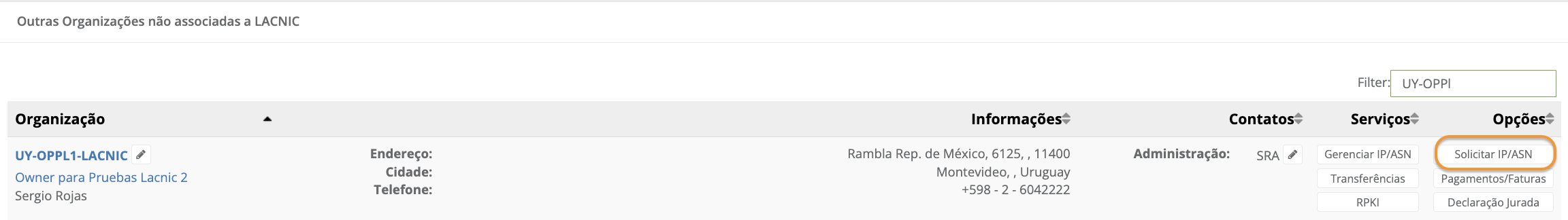 Uma vez neste menu, ao localizarmos a organização para a qual fizemos a solicitação que desejamos verificar, devemos selecionar a opção [Solicitar IP/ASN]: