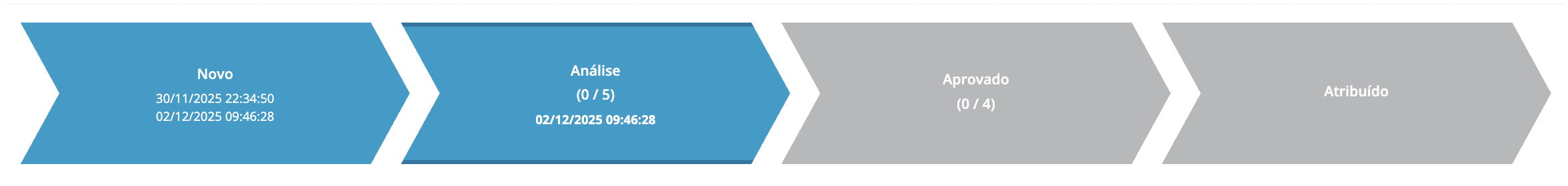 Para navegar entre as etapas, basta clicar na etapa que deseja visualizar com mais detalhe, como é o caso de “Novo”, “Análise”, “Aprovado” ou “Atribuido” no exemplo mostrado na imagem: