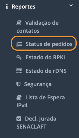 No menu de contexto, na opção [Relatórios] / [Estado de pedidos] você pode acessar o módulo Estado de Solicitações: