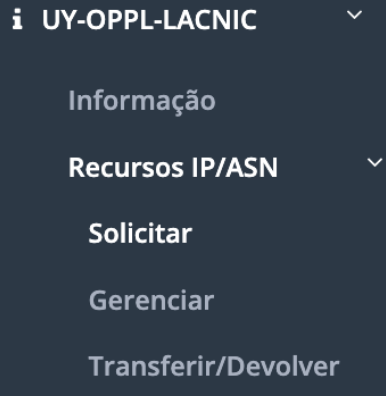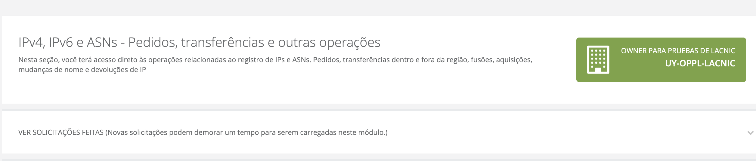 Do menu de contexto da organização, na opção [Recursos IP/ASN] / [Solicitar], você poderá acessar a seção IPv4, IPv6 e ASN - Solicitações, transferências e outras operações:
