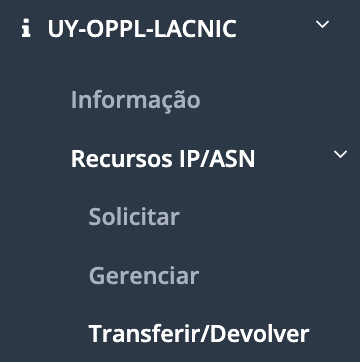 Do menu de contexto da organização, na opção [Recursos IP/ASN] / [Transferir/Devolver] você poderá acessar a seção: TRANSFERIR IPv4, IPv6 e/ou ASN - LISTAS DE TRANSFERÊNCIAS