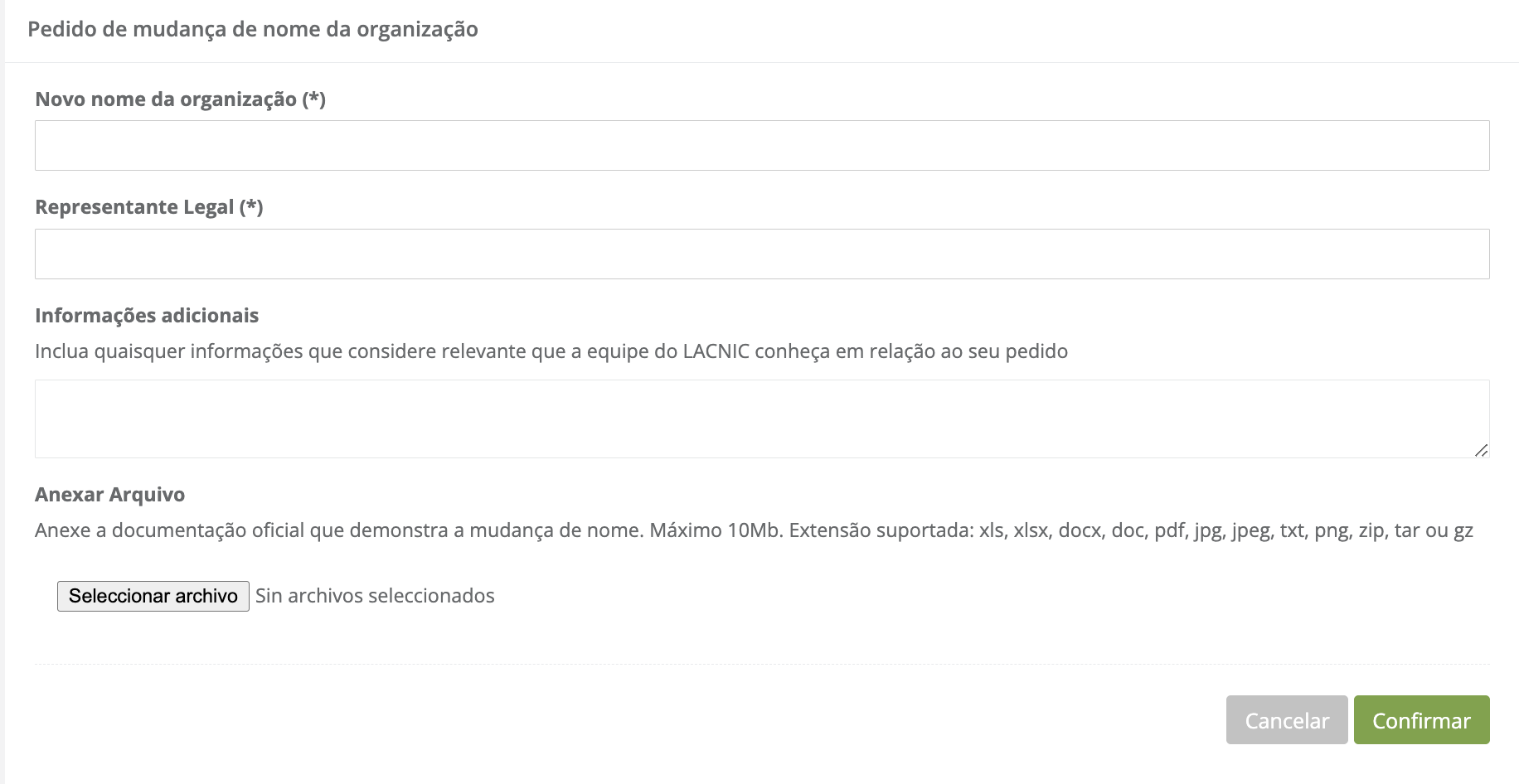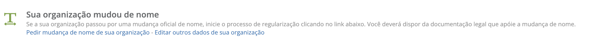 Para mudar o nome de sua organização, clique no botão: [Solicitar mudança de nome da sua organização].