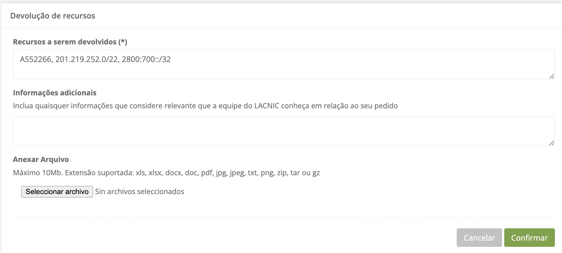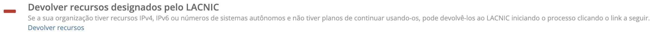 Em seguida, na seção TRANSFERIR IPv4, IPv6 e/ou ASN - LISTAS DE TRANSFERÊNCIAS, selecione a opção [Devolver recursos designados pelo LACNIC]: